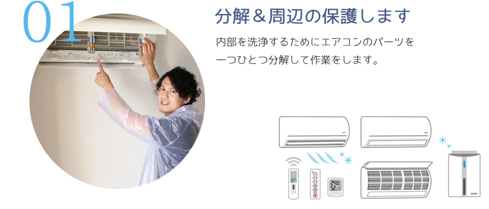 A: ご安心ください。クリーニング前にエアコン周辺をしっかりと養生し、水や汚れが飛ばないようにいたします。